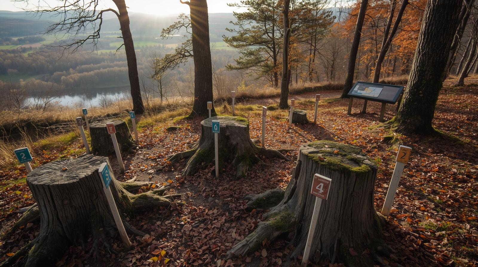 Jeder Bestattungsbaum ist durch einen Robinienpfahl mit nummerierter Plakette gekennzeichnet. Ob eine Grabstelle frei ist, zeigt eine farbige Markierung hinter der Plakette. Das ermöglicht eine klare Orientierung sowie eine sichere Auswahl der Ruhestätte im Bestattungswald.